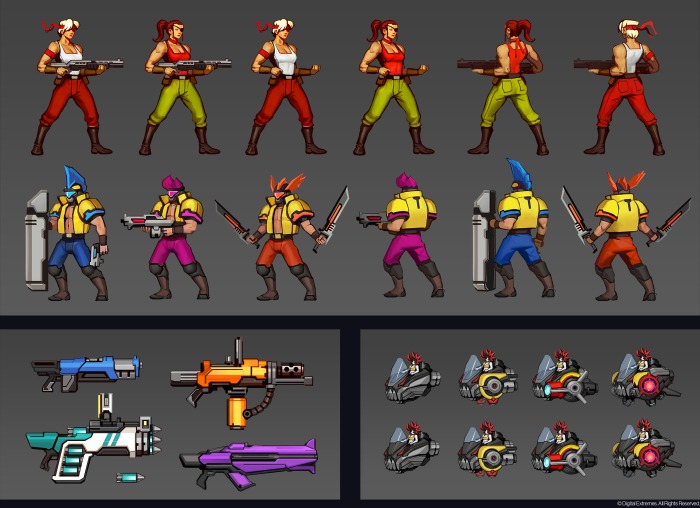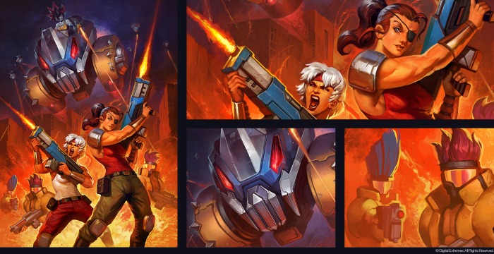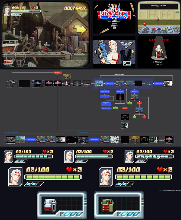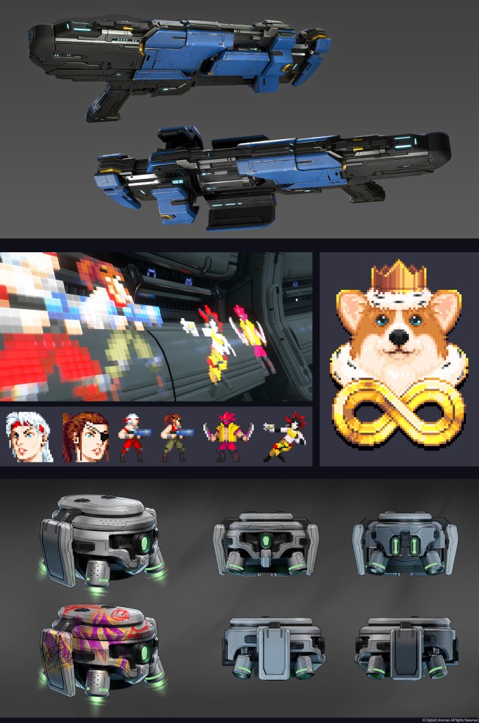 A game within a game! Play as Jillian and Lillian Killian in Caliber Chicks 2, an arcade run and gun minigame available within Warframe‘s Höllvania Central Mall of 1999. Atomhawk collaborated with Sumo Digital and the brilliant minds at Digital Extremes to contribute concept art, pixel art, UI/UX and motion graphics.